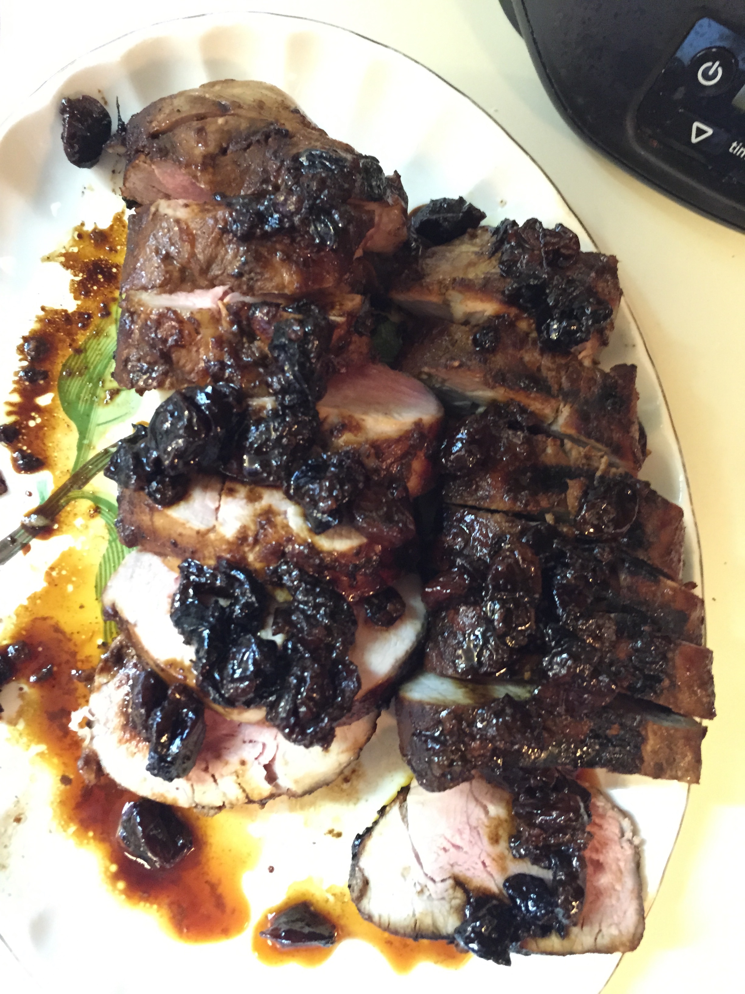 I cooked the tenderloin, turning frequently and getting all four sides, until done. It took just over 20 minutes total, and was just a teeny bit pink in the center. (It should be 145 degrees if you use a meat thermometer, but I never do)