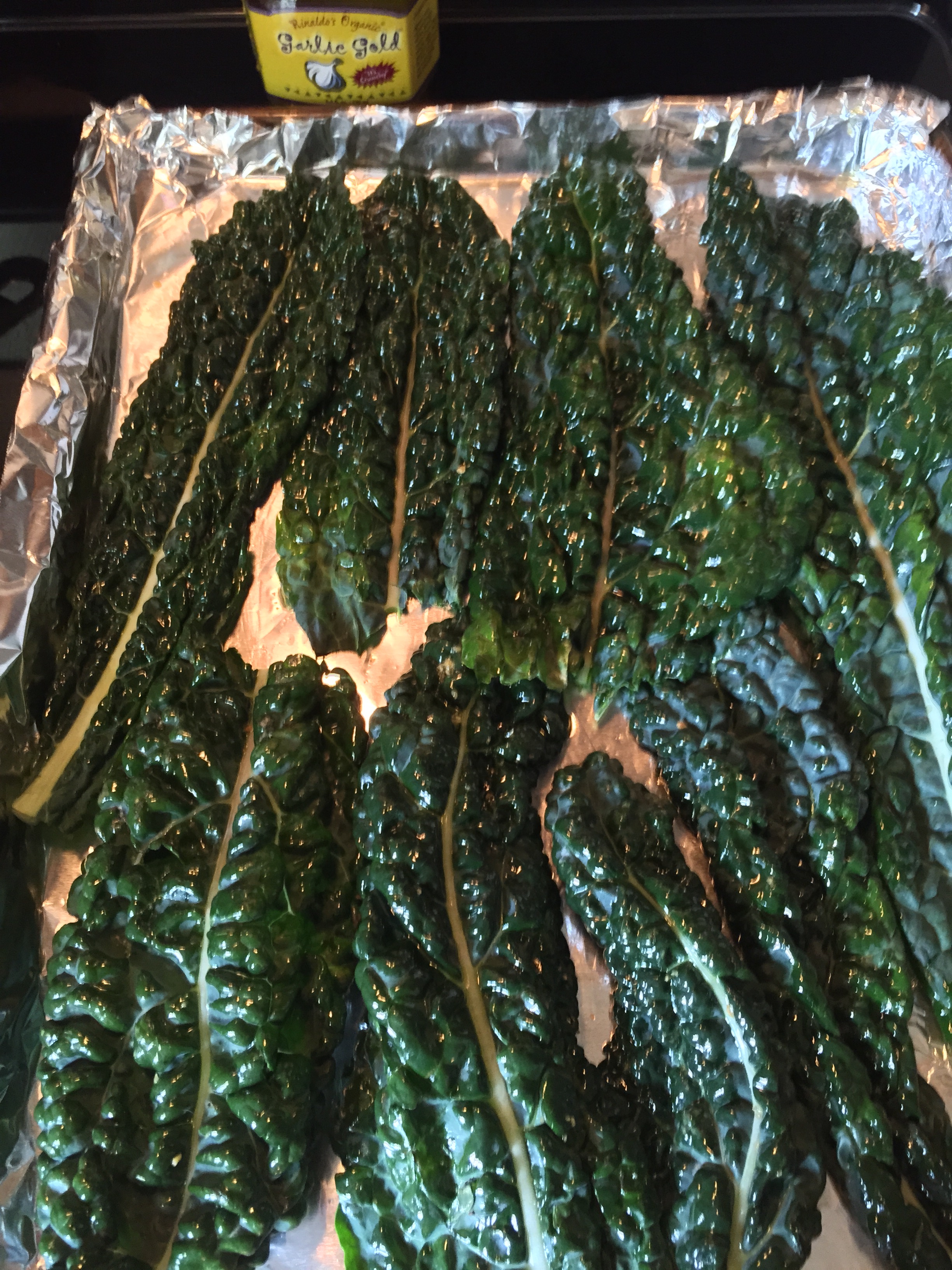 I popped the pan into a 350 degree oven for 20 minutes. Then I turned off the oven and left them there two more minutes before taking them out. They were perfect – very crunchy. (Some Italian Kale leaves are thicker than others so watch your first batch – the line between perfectly crunchy and burnt is small…)