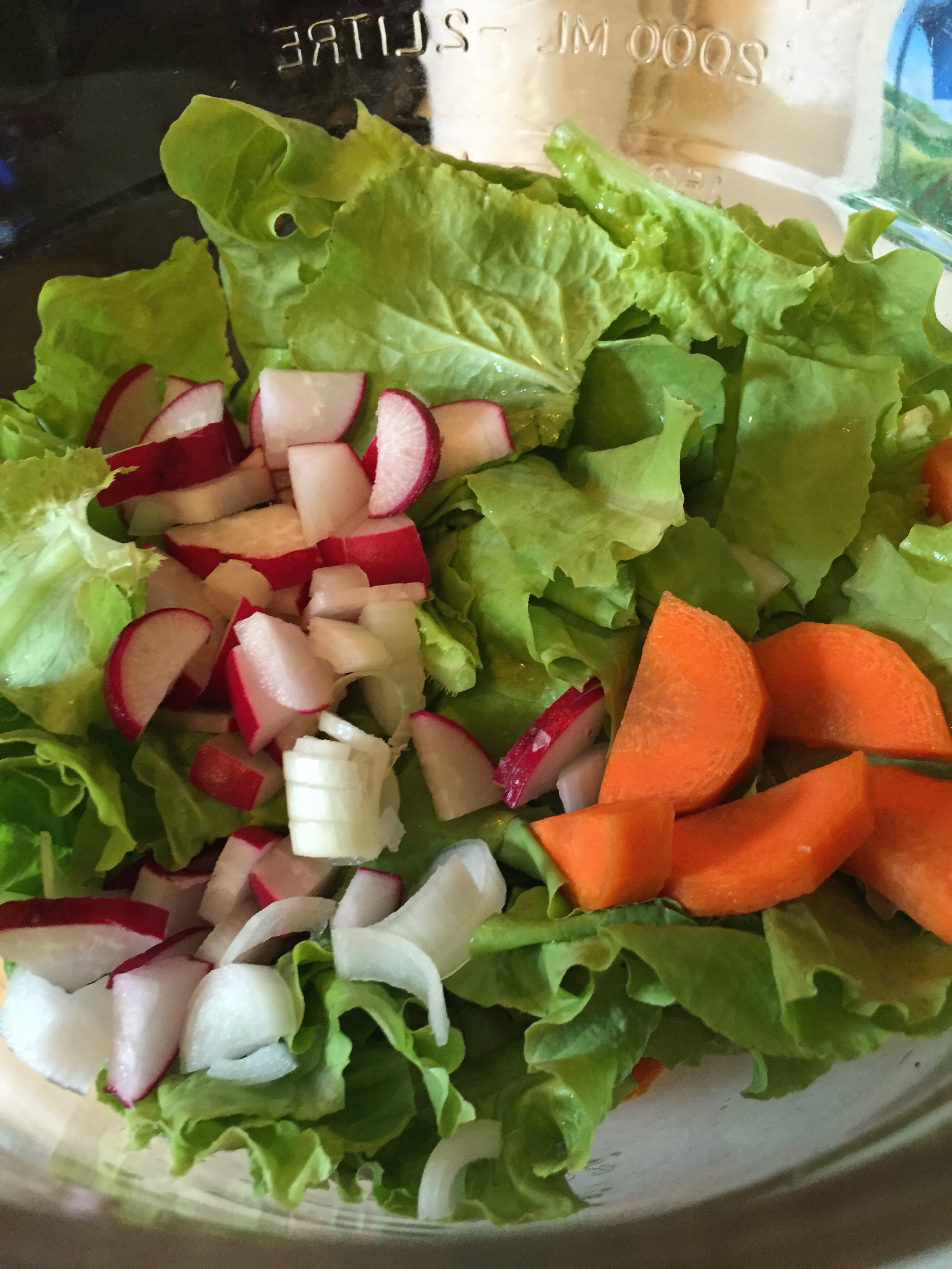 Look at that lettuce, radishes, onions. I had carrots to throw in, too, but it needed a little something…so I made bacon wrapped pineapple.