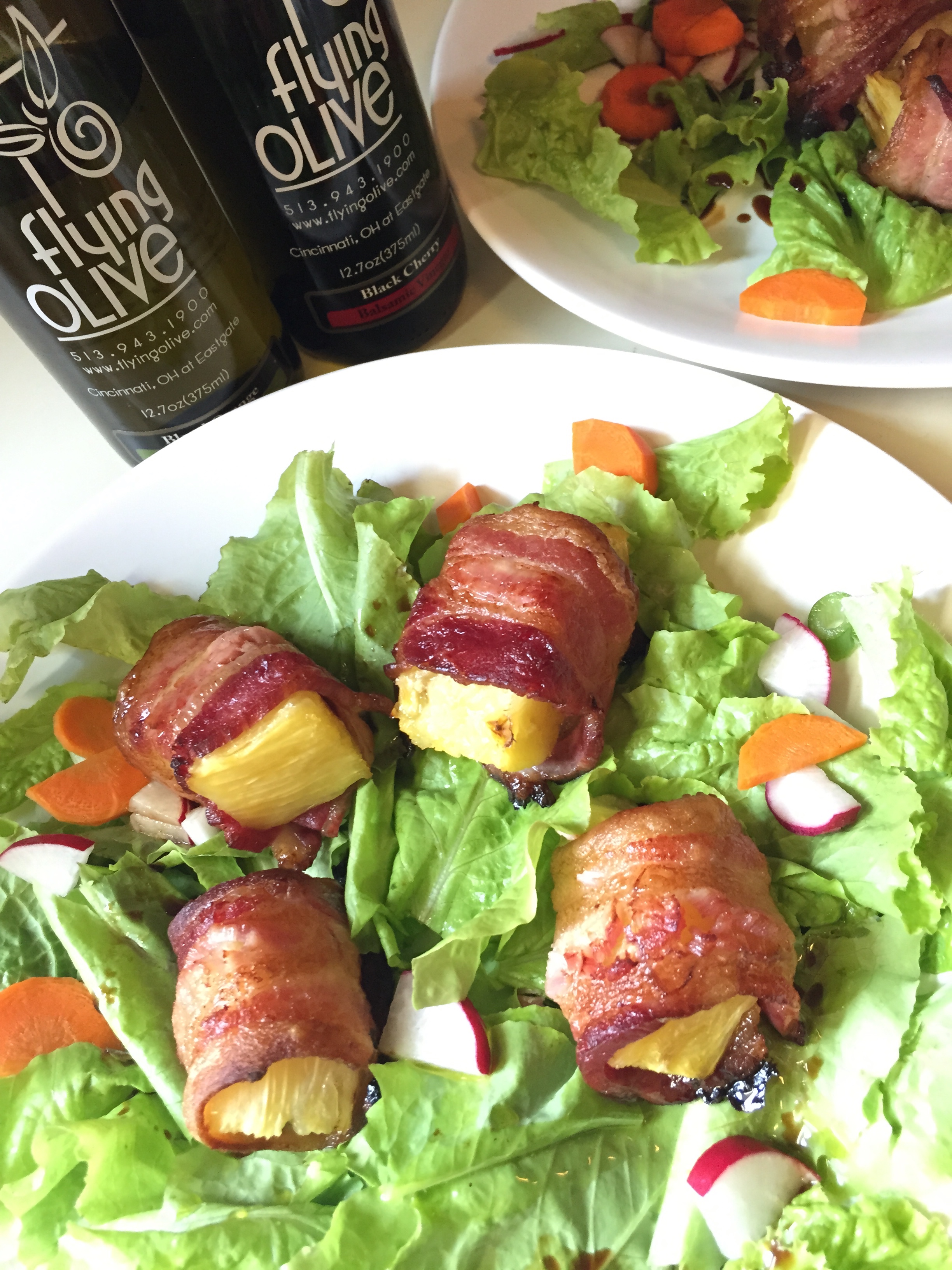I placed several bacon wrapped pineapple bites on top of the salad and dressed it with a drizzle of flyingolive.com‘s Blood Orange Olive Oil and Black Cherry Balsamic Vinegar. What a great summer combination!