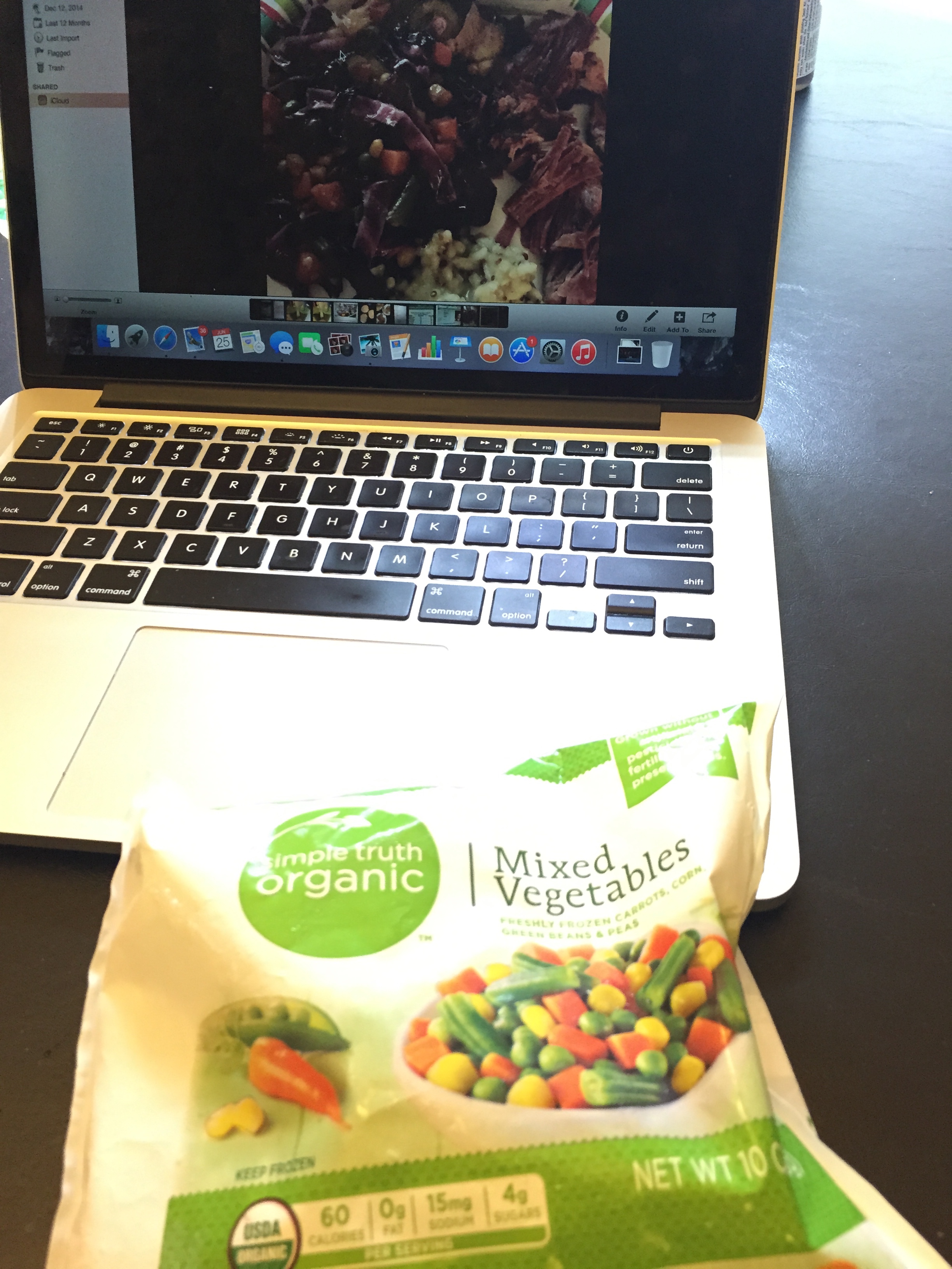 I turn the skillet to medium high and add 1 10 oz package of frozen organic vegetables and 2 TBSP diced white onion.
