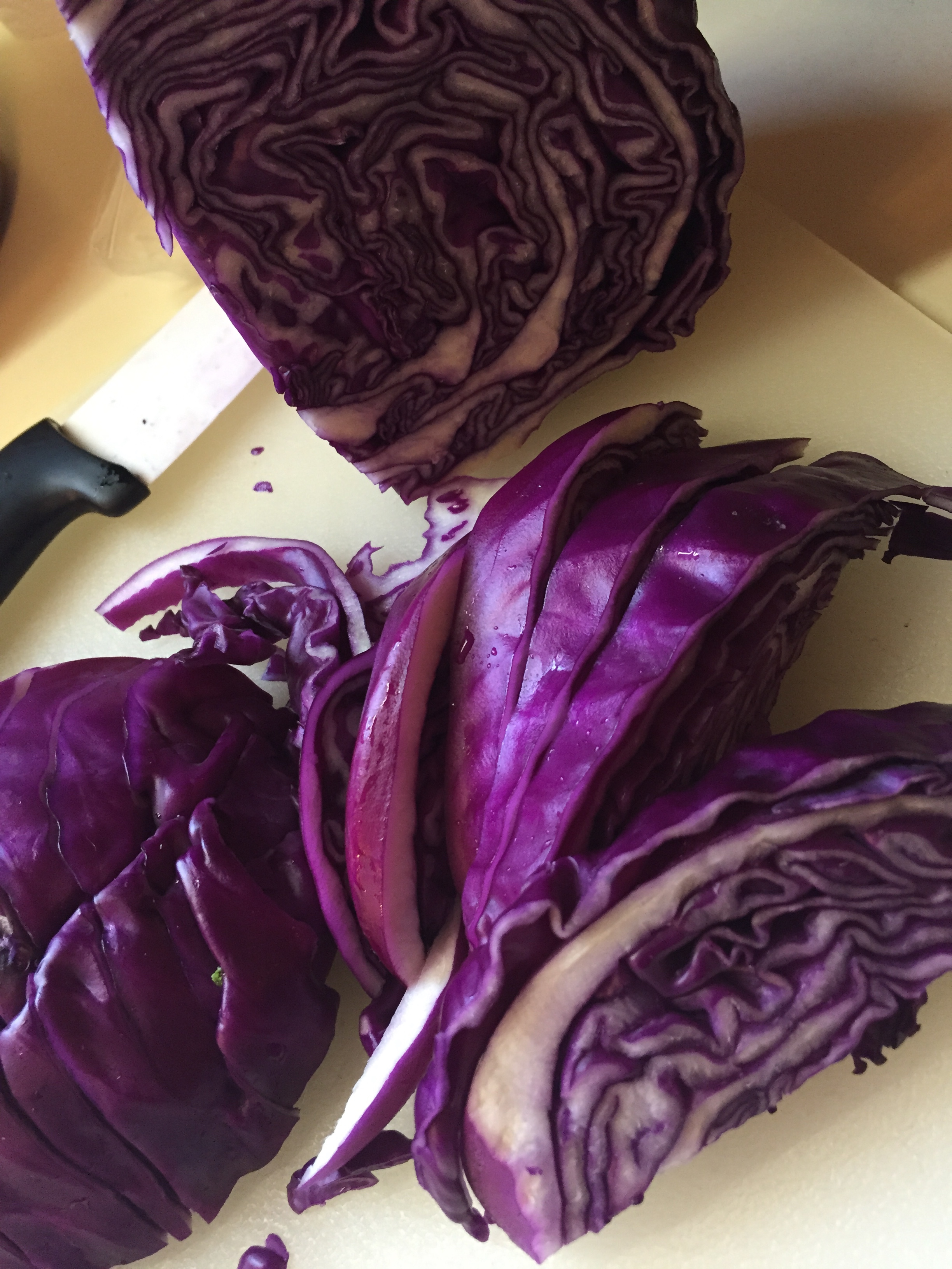 Next, I start chopping up 1/2, maybe 3/4 of an organic red cabbage. I throw that into the vegetables and stir OFTEN!