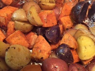 Sometimes you just don’t want to be 100% paleo, right? Sometimes it’s about the gainz and you’re lifting heavy and you need some of these kinds of carbs. Sometimes, you just long for the perfection of a perfectly roasted potato – in grass-fed butter with rosemary and garlic. So do we! I bought a bag of baby yukon gold, red, and purple potatoes and also threw in a sweet potato.