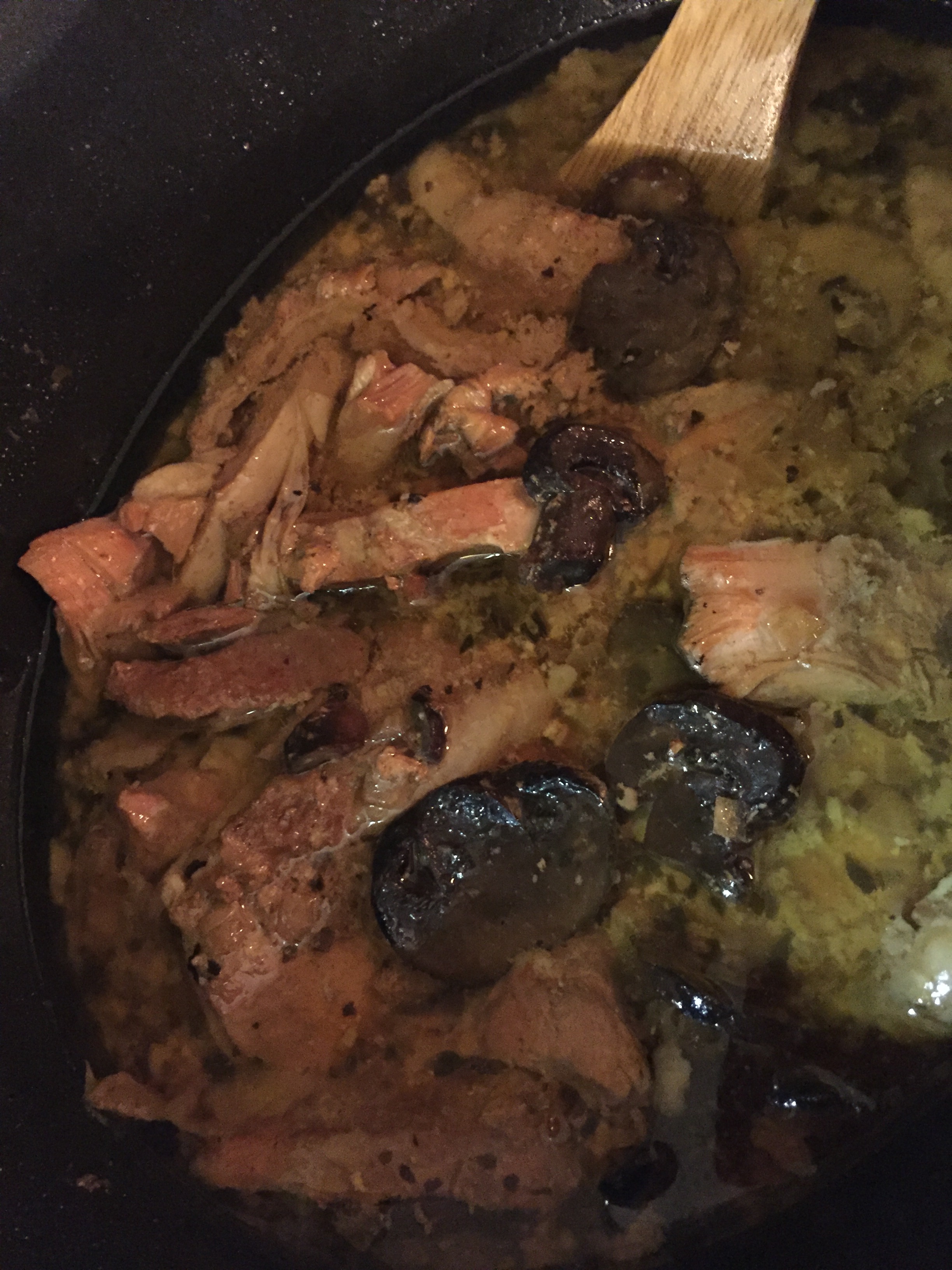 I put the lid on and cooked this on low for 8 hours. It was just all layered (see the photo, below) and I only stirred it right before we ate it. We had to watch out for the bones but they give this meal such a hearty, deep flavor that it’s worth it.