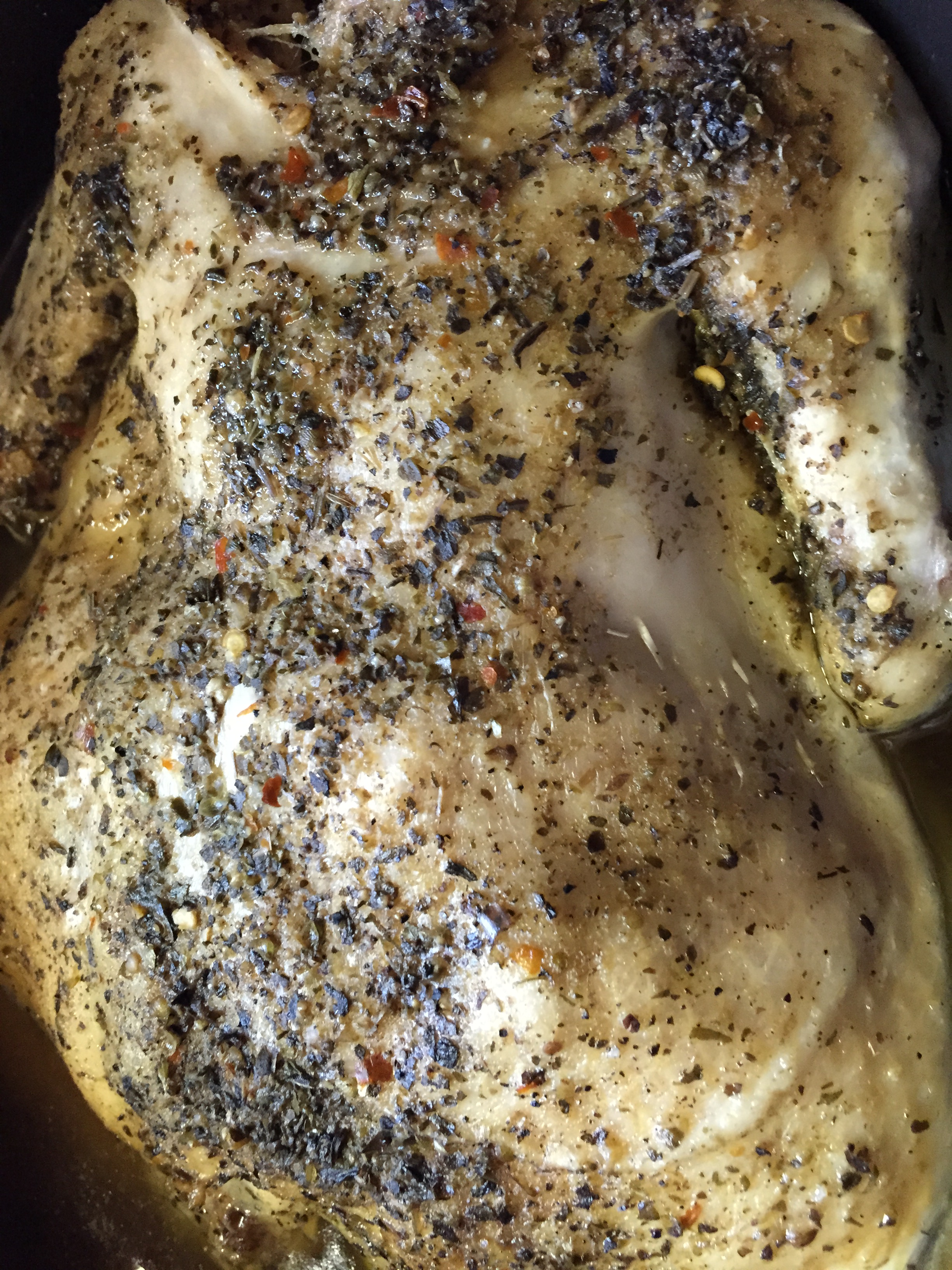 Next, I sprinkled the top of the chicken with all the same spices that I’d just used in the bottom of the crock pot, in the same amounts. I didn’t measure, but you can see from the photo that I used a LOT.