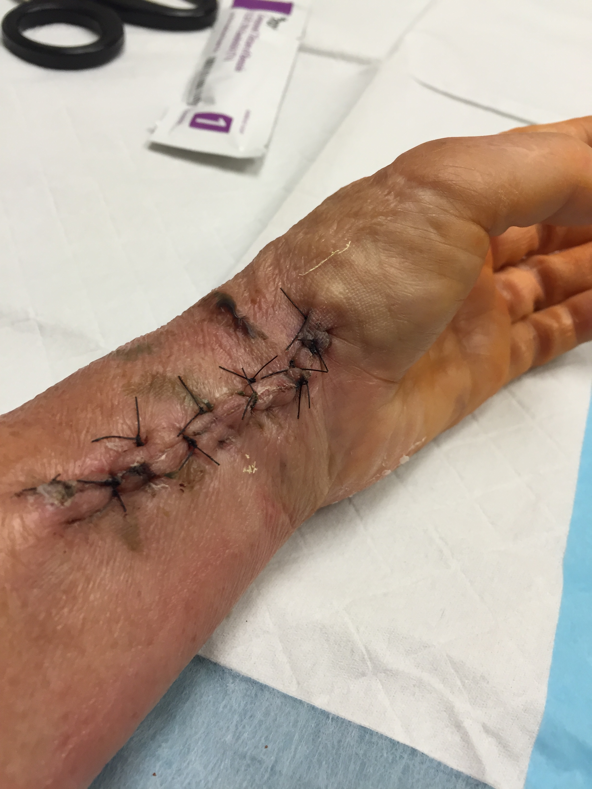 After 2 1/2 weeks of the soft cast, I went in to have it removed. There was a LOT of dried blood hiding in there which kind of freaked me out but I was anxious to see how my wrist and my incision looked under there. The incision kind of freaked me out, too, lol, as you can see in the next photo. ( no wonder I needed a long nap when I got home)