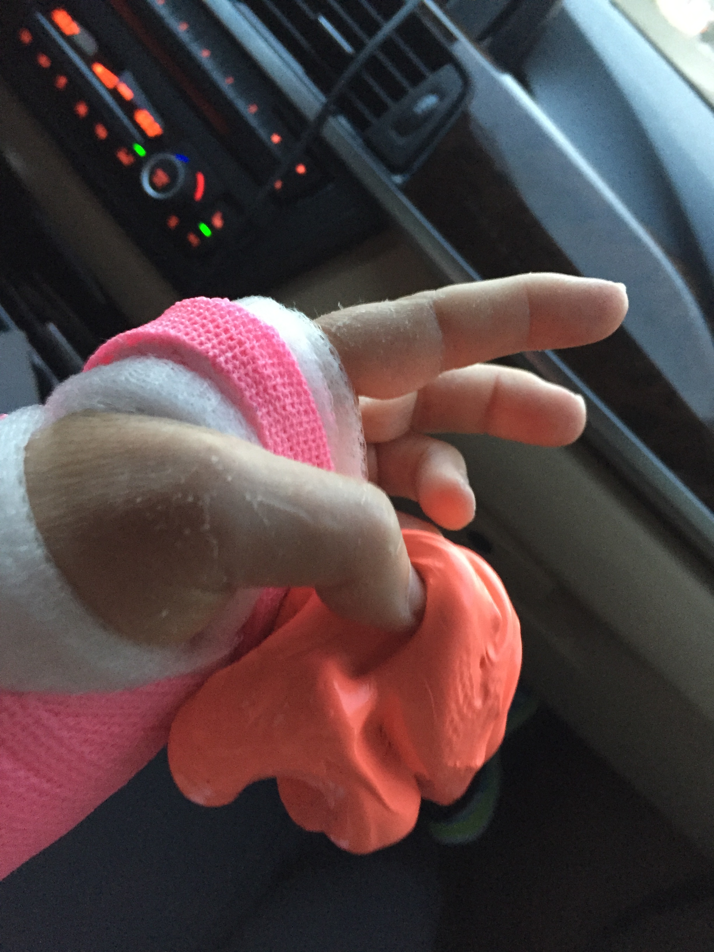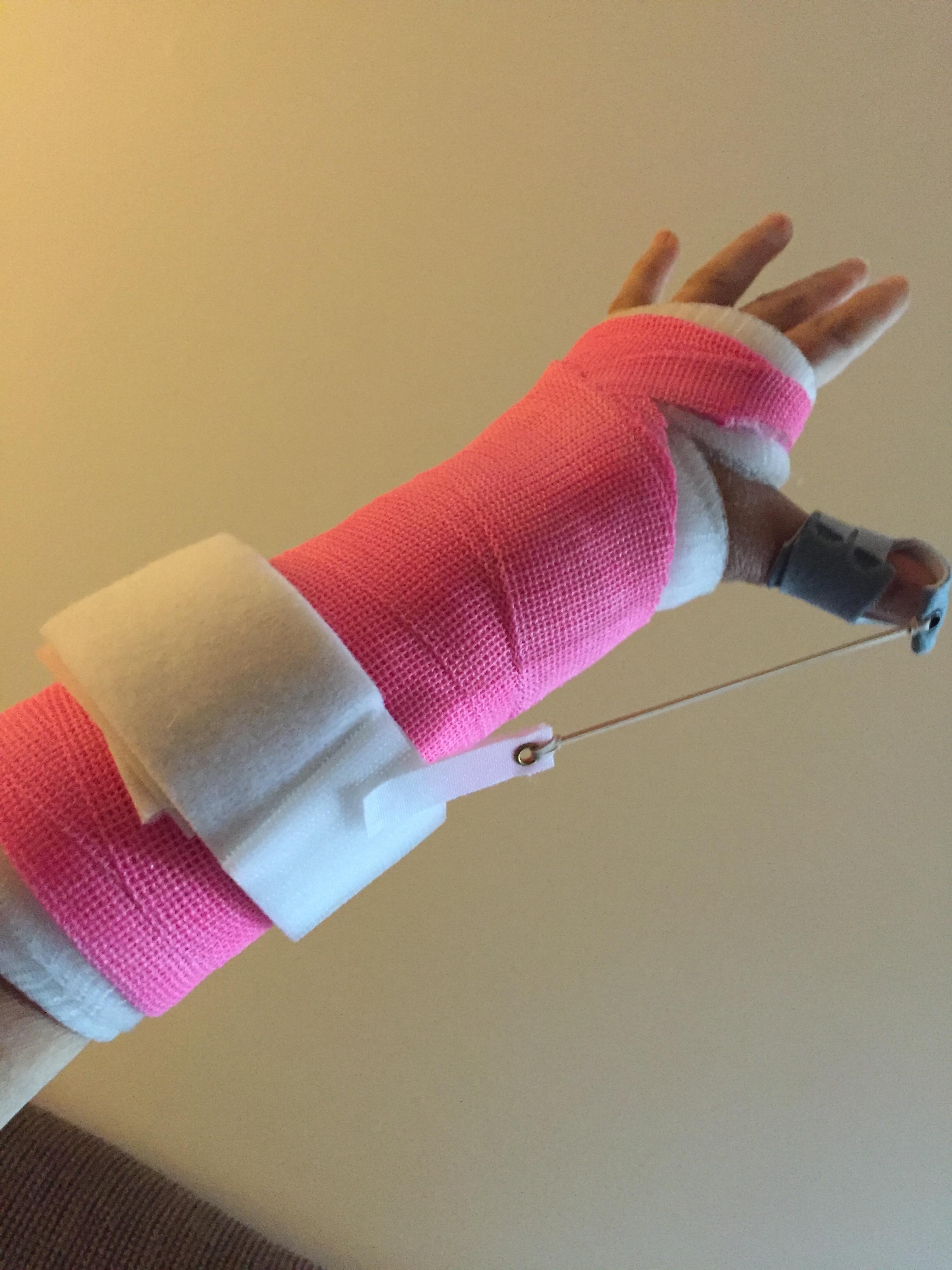At the last rehab session I even got this putty. When I told my sister, Annette, that it didn’t “match” my pink cast, she said, “It did in the 80’s.” Ha!