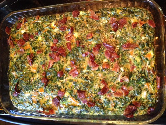 All this went into a coconut oil-greased 9 x 13 inch glass baking dish. I put it in a 350 degree oven for 40 minutes. You will want to stick a knife into the center of the casserole to see if your has set up in the center, or give it a little shake.