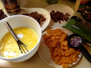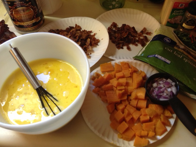 I added everything else (red onion, spinach, spices, etc.) into the egg mixture. The sweet potatoes came off the heat when I could stick a knife in them and they were fairly soft. I poured off the hot water in their pan and covered them with cold water. In a minute, they were cooled off enough to peel easily and dice. Then I put them into the egg mixture.
