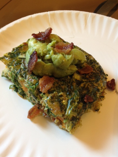 I put the 2 pieces of bacon, crumbled, on top. When I cut it, to serve, I put some guacamole on top. I used the Wholly Guacamole Classic. You could make it yourself, too. (But, DON’T buy the kind that has all those fake things and fillers in it. Guacamole should not have soybean oil. Read the label)