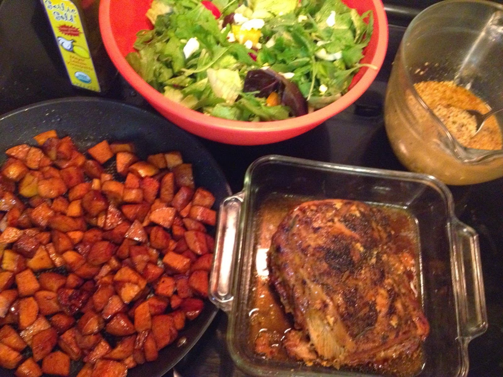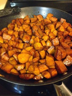 Anyway, I cooked sweet potato chunks in the skillet over medium high heat, stirring often so that the ingredients coated the sweet potatoes as they softened. I turned them to low after they softened some.